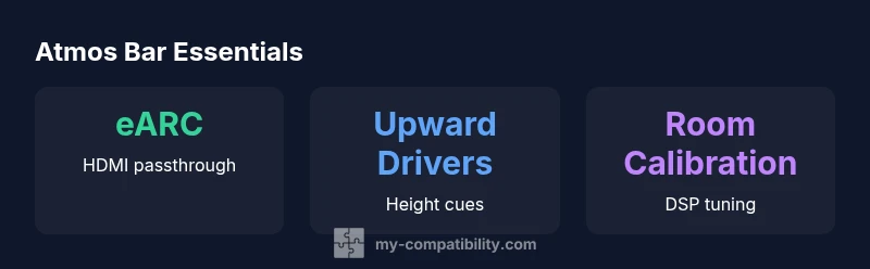 Atmos performance isn’t just about a logo; it relies on a combination of hardware and software features. Look for upward-firing or reflected-height drivers, precision DSP that maps sounds to virtual 3D space, and robust HDMI eARC bandwidth to carry high-quality Atmos metadata. A good soundbar should offer room calibration and a clear dialogue mode to avoid harsh highs or mudded mids. Subwoofer integration matters: a dedicated bass driver or wireless sub can anchor bass without masking higher-resolution spatial cues. Finally, consider whether the bar supports object-based processing across all input sources, including streaming apps and game consoles. According to the My Compatibility team, these features collectively determine how convincing Atmos sounds in real rooms.