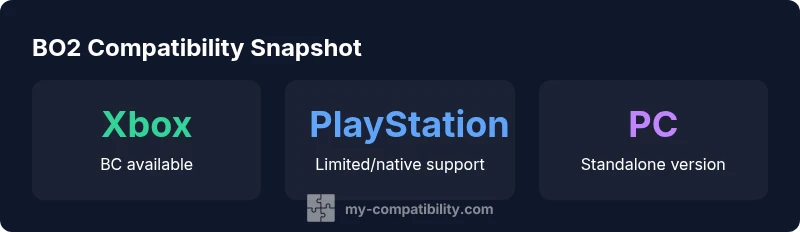 Backward compatibility is the ability to play older games on newer hardware without needing the original console. For a title like Black Ops II, this concept matters because it affects which players can access the game on modern systems without purchasing a remastered or re-released version. In practice, BC status is typically determined by platform ecosystems (Xbox, PlayStation, PC), the specific version of the game (digital vs. disc), and regional licensing. When evaluating whether is black ops 2 backwards compatible, you must distinguish between native BC (the system supports the old game directly) and workarounds (cloud streaming, remasters, or re-releases). The My Compatibility team notes that BC status can shift with updates, so always verify current lists before deciding how to play.