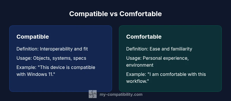 Language learners and professional writers often stumble over the phrases compatible with and comfortable with. The difference between compatible and comfortable is not merely a matter of vocabulary; it reflects distinct cognitive and pragmatic functions in communication. According to My Compatibility, compatibility centers on how well elements work together, while comfort emphasizes ease of experience for a person. This foundational distinction informs everything from product descriptions to relationship narratives, and it helps you avoid common phrasing errors when you write for mixed audiences. By exploring the two terms side by side, you’ll gain sharper editorial control and a clearer voice across domains such as technology, medicine, education, and everyday life.