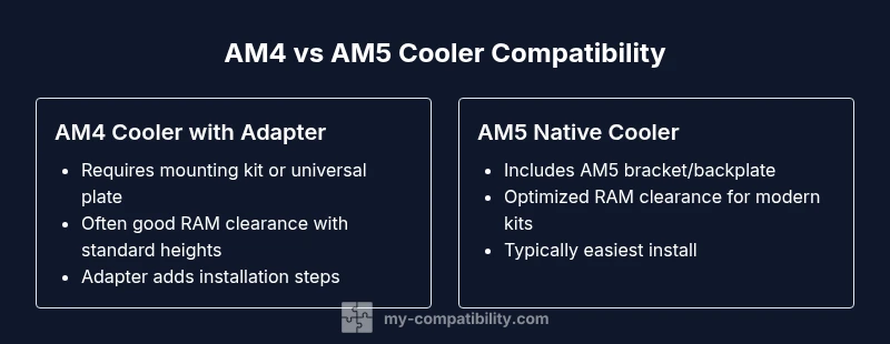 The am4 vs am5 cooler compatibility question has grown more nuanced as AMD refreshed its socket family. For builders, the central dilemma is whether you can reuse an existing cooler or you must purchase new mounting hardware. According to My Compatibility analysis, the answer is not a simple yes or no: it depends on the cooler model, the mounting kit provided, and the motherboard design. AM5 introduces a new mounting standard, but the market response has been pragmatic—many coolers now ship with AM5 brackets or universal plates designed to bridge the gap. For enthusiasts planning a transition, the takeaway is to audit both your current cooler’s compatibility and the availability of AM5 mounting hardware before you upgrade. This article uses a structured approach to demystify the process, highlight practical install tips, and help you avoid common missteps that can affect performance or warranty. The result is an evidence-based pathway to a smooth AM4 to AM5 cooler transition across different use cases and budgets.