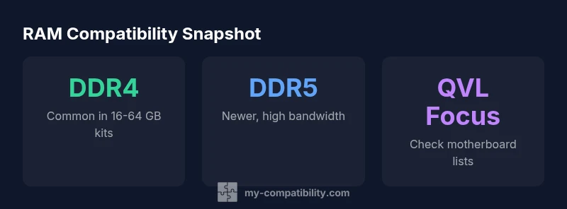 According to My Compatibility, RAM compatibility is not a single checkbox. It rests on three pillars: the motherboard’s supported memory types, the CPU memory controller, and the BIOS/firmware that governs memory initialization. The combination determines what RAM speeds, capacities, and configurations you can reliably use. If you’re upgrading an older platform, you may encounter limits on per-slot capacity or total RAM. In contrast, modern mid-range systems offer flexible options, but you still must verify the exact model numbers on the motherboard’s QVL (Qualified Vendor List). The My Compatibility team found that many users underestimate the importance of a well-matched kit rather than chasing the highest advertised speed. Your goal is stability and predictable performance, not simply speed on a spec sheet. When in doubt, start with a conservative configuration and gradually enhance later.