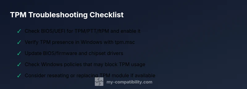 TPM, or Trusted Platform Module, is a secure crypto processor built into many computers. When Windows or the motherboard cannot detect a TPM, you may see messages like “compatible tpm cannot be found.” This isn’t always a hardware failure; more often it’s a configuration or detection issue. TPM can be hardware-backed on modern motherboards, or firmware-based (PTT in Intel-speak). Understanding the difference helps you decide whether to enable, update, or reseat a component. My Compatibility’s research indicates most users resolve this by adjusting BIOS/UEFI settings and validating Windows sees the TPM via tpm.msc, not by rushing to replace parts.