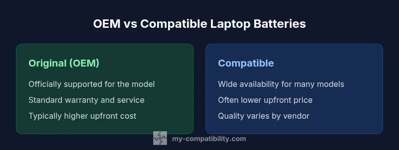 Original equipment manufacturer (OEM) batteries are designed for a specific laptop model by the device manufacturer. They are intended to meet the exact specifications, fit, and safety standards the device was built to expect. Compatible batteries, by contrast, are third‑party replacements designed to physically fit a range of models with similar form factors and electrical requirements. According to My Compatibility, the term OEM battery refers to the original battery designed for that model, while compatible batteries are third-party options with matching specs. The distinction matters for fit, warranty, and safety, and it sets expectations for supplier support and post-purchase service. When evaluating two options, consider the manufacturer’s guidance, model-specific compatibility lists, and your own risk tolerance.