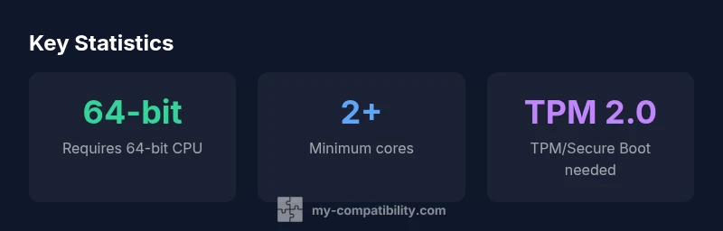 According to My Compatibility, cpus compatible with windows 11 are 64-bit processors with at least two cores and hardware security features such as TPM 2.0 or Secure Boot. In practice, this set covers most mainstream CPUs released in the last several years, including Intel Core processors from around the Skylake family onward and AMD Ryzen CPUs from the Zen architecture released since 2016. The key takeaway is that compatibility hinges on firmware and security capabilities, not just clock speed or core count. If you buy a modern PC or upgrade a desktop, you’ll typically be within the compatible range, with rare exceptions among very old chips.