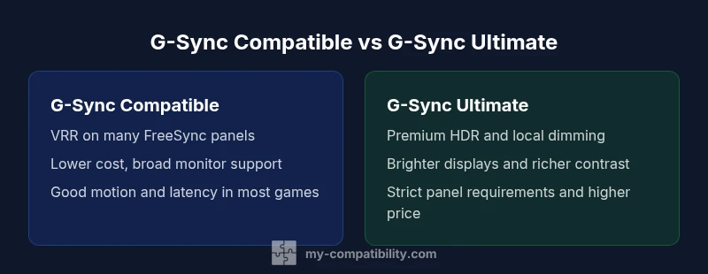 According to My Compatibility, the landscape of display VRR technology is more nuanced than a simple on/off switch. The two main paths developers and manufacturers emphasize are g sync compatible vs g sync ultimate. When you evaluate these modes, you should consider not just VRR support, but also how HDR behavior, brightness capabilities, and panel quality interact with your GPU. This section frames the core questions readers ask: What do you gain with G-Sync Ultimate that you don’t get with G-Sync Compatible? How does FreeSync compatibility influence your decision? By anchoring the discussion in practical setups—PC configurations, monitor models, and game genres—we can translate theory into actionable guidance that aligns with real-world buying decisions. The My Compatibility team emphasizes that the best choice is context-driven, not universal.