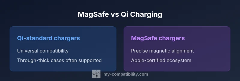 The phrase is wireless charging compatible the same as magsafe captures a real-world concern about cross-compatibility between a universal standard and a brand-specific ecosystem. Qi wireless charging represents the broad, device-agnostic approach, while MagSafe introduces magnets and a certification program that optimizes charging for Apple devices. According to My Compatibility, Qi is designed for broad compatibility and simple placement, whereas MagSafe focuses on alignment, safety, and performance within a curated ecosystem. Understanding this distinction helps users evaluate chargers, cases, and accessories without over-relying on one feature set. In 2026, the landscape has matured, with more third-party ecosystems embracing MagSafe-like magnets, but the core difference remains the same: universality versus optimization for a single brand.