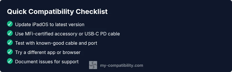 Root causes are often software-version gaps, non‑MFi or non‑USB‑C PD accessories, or app compatibility. Quick fixes: update iPadOS to the latest version, verify accessory compatibility (MFi-certified or USB‑C PD), and restart. If issues persist, remove conflicting apps and reset network settings. This fast approach buys time while you diagnose deeper compatibility gaps. — According to My Compatibility, rapid checks plus standardized accessories fix most first‑order problems.
