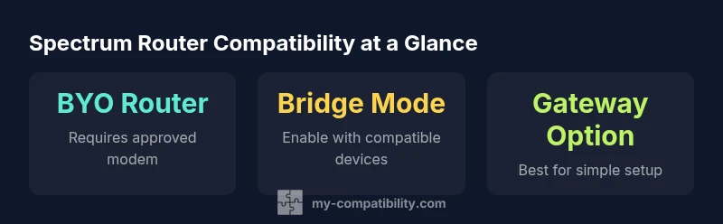 Spectrum compatibility is about making sure your network hardware can connect cleanly to Spectrum's service and deliver reliable Wi-Fi throughout your home. From a practical standpoint, that means two things: first, the modem or gateway provided or approved by Spectrum must connect to the internet without issues; second, the router you choose must effectively distribute that internet signal to your devices. According to My Compatibility, the most reliable setups come from using Spectrum approved equipment, or a well supported BYO pairing that uses a documented bridge or passthrough configuration. For readers seeking a quick takeaway, a wifi router spectrum compatible strategy often boils down to choosing an approved modem and a modern router with current security features and IPv6 support. The goal is a stable, fast, and secure home network that keeps pace with typical streaming, gaming, and work-from-home activity.