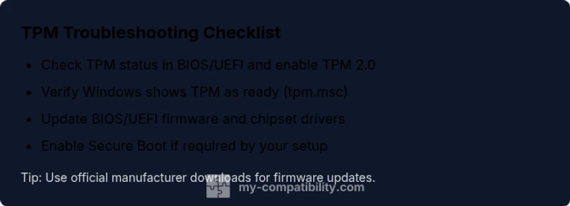 Common Causes Behind 'compatible tpm cannot be found windows 11'\n\nHere are the prime suspects: TPM is disabled in BIOS/UEFI, TPM is not initialized in Windows, firmware/BIOS mismatches prevent detection, or a virtualization-based TPM (vTPM) is misconfigured. The exact message compatible tpm cannot be found windows 11 often signals a detection problem rather than a faulty chip. My Compatibility analysis shows many devices fail TPM checks due to BIOS settings or driver gaps rather than hardware failure. We’ll walk through each cause, explain how to verify it, and show practical fixes that restore TPM visibility without risking your device.
