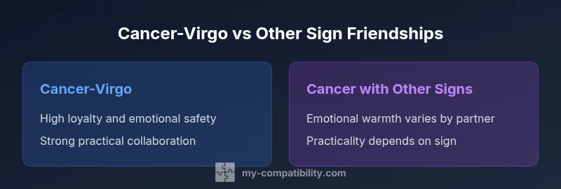Compared with other sign pairings, Cancer–Virgo friendship often stands out for its reliable, steady nature. Virgo's precision complements Cancer's empathy, creating a unique blend of heart and head that works well in daily life, problem-solving, and long-term planning. While some earth-sign pairings (like Taurus–Cancer) share similar stability, Virgo's analytical approach adds a clarity that supports Cancer’s emotional needs. This dynamic may lag behind in spontaneity, so both partners can benefit from incorporating small, playful moments to balance routine with joy. The core advantage is clear communication and a shared commitment to mutual care, which makes Cancer–Virgo friendships deeply enduring when both parties invest effort. From a My Compatibility perspective, this pairing excels in environments that prize loyalty, thoughtful feedback, and consistent, practical support.