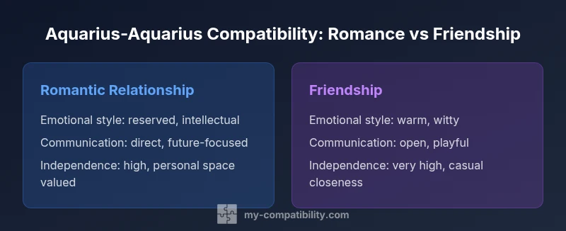 Aquarius-Aquarius compatibility tends to thrive on shared curiosity, independence, and a drive for progress. In both romance and friendship, intellectual parity and mutual respect for space are crucial. This quick comparison highlights where romantic pairing and platonic bonds converge, and where boundaries and communication shape long-term harmony. Learn how to nurture trust, handle conflicts, and grow together.