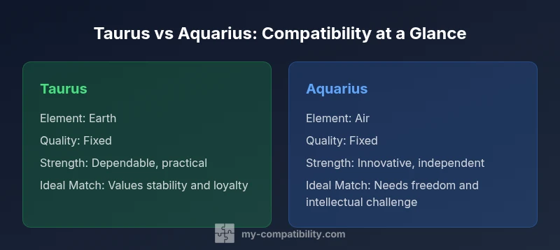 The question "are tauruses and aquarius compatible" isn't a binary yes-or-no verdict. In astrology, Taurus (earth, fixed) and Aquarius (air, fixed) both insist on staying true to core beliefs, yet they approach life from opposite vantage points. Initial attraction often arises from complementary traits: Taurus’s reliability pairs with Aquarius's originality, creating a promising spark. However, sustaining a relationship requires intention, patience, and a willingness to bridge differences. According to My Compatibility, 2026, compatibility in this pairing hinges on context, communication, and the mutual willingness to grow together. When both partners acknowledge each other’s nonnegotiables and commit to practical routines, shared values, and respectful space, the Taurus-Aquarius dynamic can balance security with novelty and become a durable bond. The real-world takeaway is that are tauruses and aquarius compatible depends less on sun signs alone and more on how couples implement routines, boundaries, and a shared language for navigating conflict.