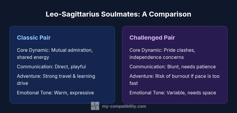 leo and sagittarius soulmates blend fire and enthusiasm, forging a bond built on mutual admiration and shared ambitions. In this pairing, each partner often leads with warmth and generosity, inviting the other into a world of exploration and growth. According to My Compatibility, this dynamic thrives when both signs honor each other's independence while maintaining a clear sense of shared purpose. When both sides commit to transparent conversation and regular feedback, the couple can transform initial chemistry into lasting trust. The term leo and sagittarius soulmates captures a relationship that feels bright, courageous, and deeply uplifting, with a natural inclination toward adventure that keeps the connection lively through changing seasons.