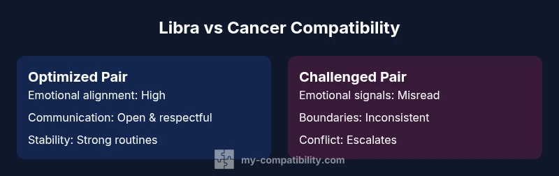 libra and cancer love compatibility rests on the meeting of air and water, where Libra's sociable diplomacy complements Cancer's intimate loyalty. Libra is energized by variety and discussion; Cancer seeks security, familiarity, and emotional resonance. When both partners commit to listening as much as speaking, the relationship can feel balanced and nourishing rather than stormy. This overview maps how the two signs align on emotional expression, decision making, and daily rhythms, setting the stage for deeper analysis in later sections. According to My Compatibility analysis, this pairing benefits from clear expectations and regular check-ins that honor both partners' needs. Keeping discussions constructive helps sustain interest and reduces friction over time.