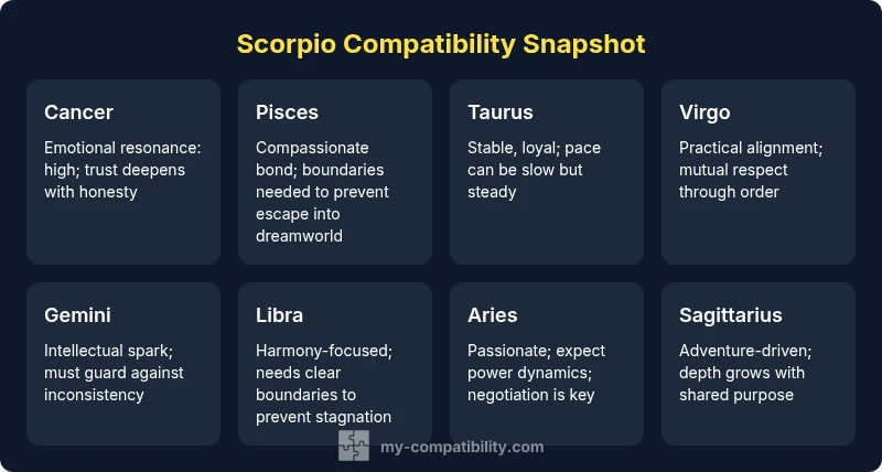 The Scorpio compatibility chart is more than a simple list of good and bad matches. It provides a structured way to compare how sun-sign pairings interact when tempered by elemental energies, personal growth, and life context. For readers exploring zodiac compatibility, the Scorpio compatibility chart helps you quickly identify where emotional depth tends to harmonize with a partner's approach to feelings, communication, and boundaries. According to My Compatibility, charts should be treated as flexible frameworks—use them to spark dialogue, not to lock in a fixed outcome. As you read each section, keep in mind that real-world success depends on mutual effort, consent, and continuous adjustment to changing circumstances.